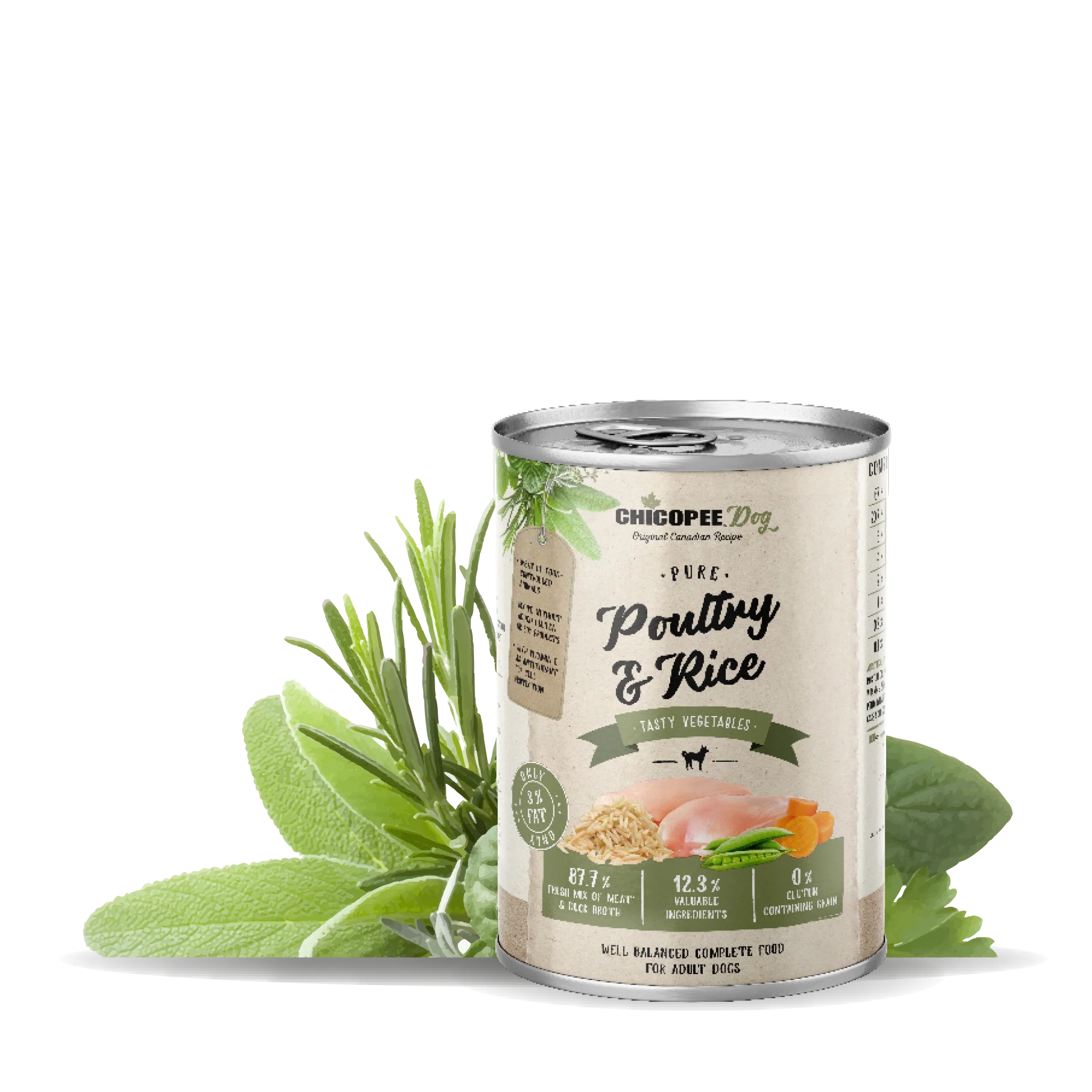 Σύνθεση : 67% Κρέας και ζωικά παράγωγα (συμπεριλαμβανομένων 30% πάπιας, 25% κοτόπουλου), 20,7% ζωμός πάπιας, 5% ρύζι, 4% καρότα, 2% μπιζέλια, 1% μέταλλα, 0,2% έλαιο ελαιοκράμβης, 0,1% ινουλίνη.